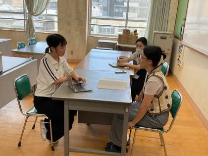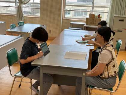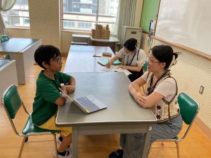 外国語の授業でパフォーマンスチャレンジを行いました。これまで授業で学習してきた内容を使って、英語で会話をします。外国語の専科の先生とALTの先生に練習してきた英語を一生懸命、伝えていました。とても緊張したようですが、精一杯伝えられたようです。