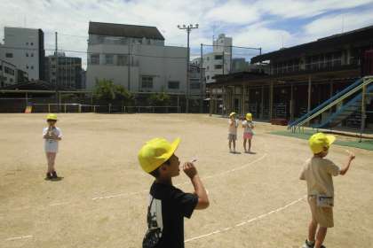まずは、普通のシャボン玉液でどんなシャボン玉ができるのか、やってみようということで、運動場で思いきりシャボン玉を飛ばして遊びました。