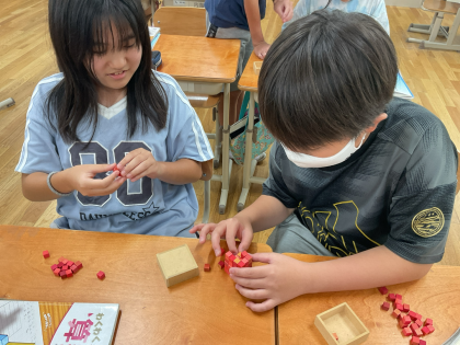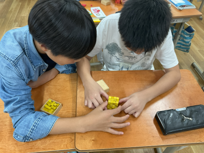 立体の体積の学習をしました。角柱の体積はどのように求めたら良いのか、考えました。底面積×高さで求められることがわかりました。実際に1㎤のブロックを使って、問題の角柱を作りました。底面積を作ってから、高さを作っていきました。実際にブロックを使いながら、考えることができたのでわかりやすかったようです。