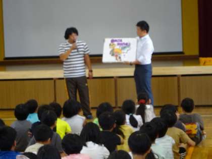 避難訓練後、体育館に全校児童が集まり、「いかのおすし」(行かない・乗らない・大声でさけぶ・すぐに逃げる・知らせる)について、警察の方からわかりやすくお話をいただきました。