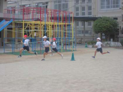 100メートル走の練習では、自分のコースを確かめたり、一緒に走る友達の走る様子を確かめたりしていました。