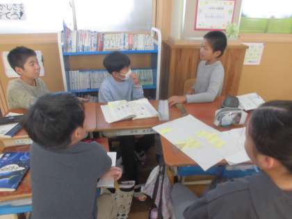国語科では、よりよい学校生活を送るために、解決したい課題を考え、議題として取り上げ、話し合う学習を行いました。議題ごとにグループに分かれ、自分の立場を明確にして話し合っていきました。グループの中で話し合うことで、考えをまとめることの難しさを知ったり、条件をはっきりと決めることで、解決方法にたどり着くことも学ぶことができました。話し合いの結果、出た解決策はこれから実際に実行してきます。