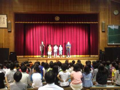 「河童の笛」という民話劇を全校で鑑賞しました。1部は発声練習をしたり,劇の予告編を児童代表の人が朗読練習したりしました。そして,本番。