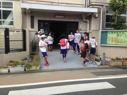 今日は6年生の当番でした。6年生は8時30分から「朝ラン」をするので,登校したらすぐに着替えます。なので,担任の西田先生も体育の服装に似た色合いで,統一感のある「おはよう運動」でした。