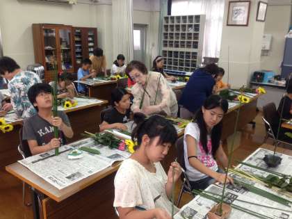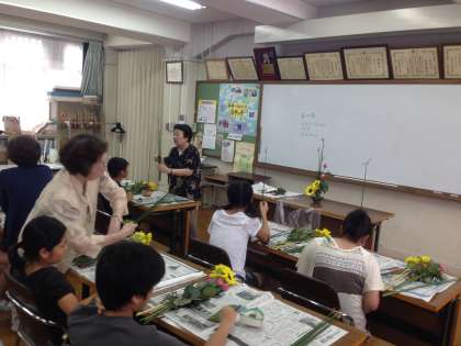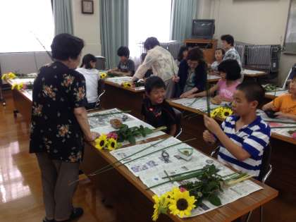 6年社会科の学習で室町文化の学習のあと,お茶とお花の体験をしました。お花は教業の女性会の方たちに教えていただきました。お手本を見せてもらって,高さや奥行のことを考えながら剣山に生けていきました。心静かにお花に向かい合うと優しい気持ちになれたのではないでしょうか。