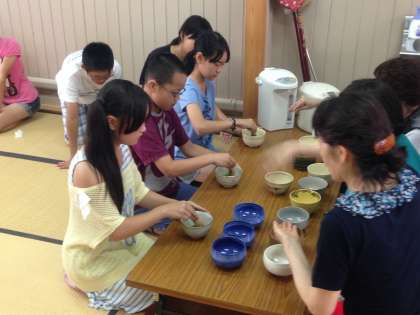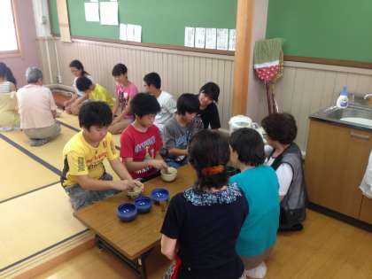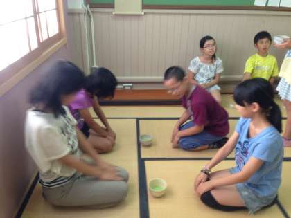 茶道は,乾女性会の方々に教えていただきました。お菓子は「天の川」で爽やかな水色のお菓子です。姿勢やお辞儀の作法,言葉遣いなど昔から引き継がれてきたものを教えていただきました。お点前をする役といただく側にわかれておもてなしの練習ができました。
