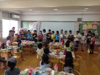 また,1年生に食べてもらおう、、ということで給食中のランチルームに各国の料理を持っていき,それぞれの名前や特徴を紹介してプレゼントしました。1年生にお礼の手紙をもらって,とてもうれしそうな6年生でした。
