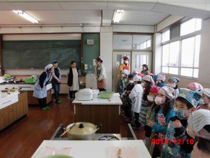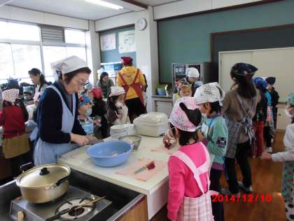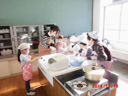 教業女性会のみなさんにお手伝いいただいて,おいもパーティをしました。切り方を教えてもらっておいもを切り,ごはんと筑前煮に入れました。