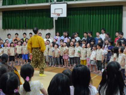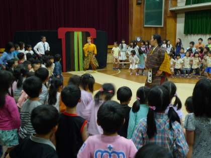 劇団の方に来ていただいて子どもにもわかりやすい狂言を見せてもらいました。3つのお話とワークショップで親しみやすく楽しいひと時でした。ワークショップでは立ち方や笑い方など教えてもらって挑戦しました。