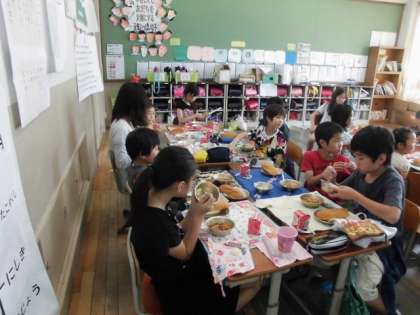 今年度初めてのたてわり給食でした。5,6年生が配食してくれます。顔合わせや体力テストで一緒に過ごしたのでだいぶ顔も覚えていて楽しそうに過ごしていました。6年生の成長ぶりがうかがえました。