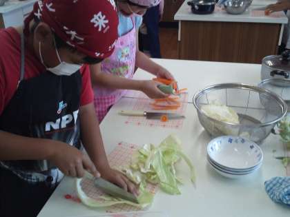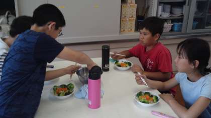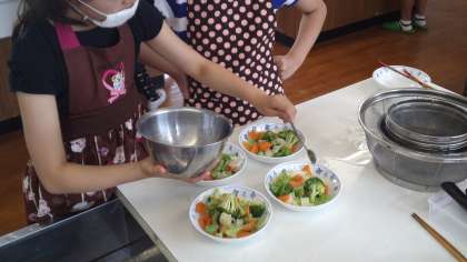 初めての調理実習はゆで野菜です。素材(野菜)をおいしく食べるためにはどのような方法があるか,班で考えました。まずは「ゆでる」ことに挑戦です。大きさやゆでる時間など素材に合わせて考え,ドレッシングも手作りしました。