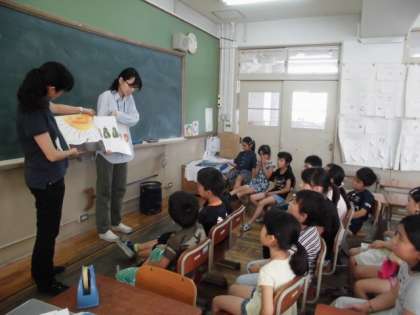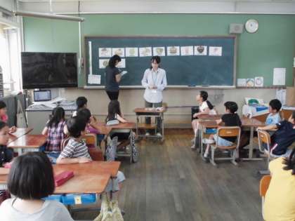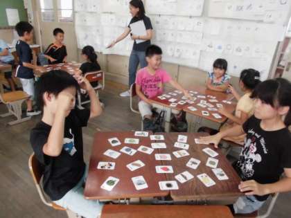 「はらぺこあおむし」の絵本を英語で読み聞かせしてもらい,いろいろな食べ物を英語で言ったり,英悟のカードでかるたゲームをしたりしました。先生がだしたカードを見て,「Cake!」「Melon」と元気よく言えていました。とりあえず恥ずかしがらずに声に出すことや友達と知っている言葉でやり取りすることが大事だと思います。