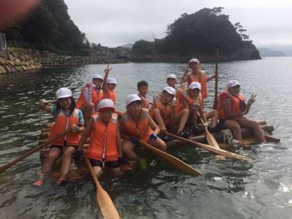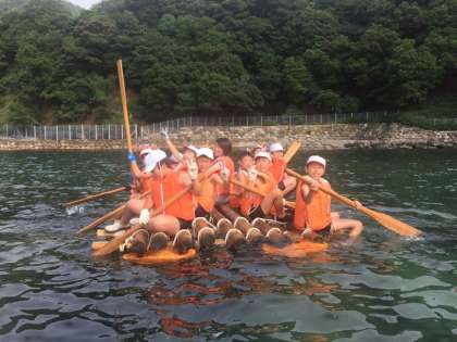 いかだで海に漕ぎ出した写真です。この笑顔の後には過酷な後片付けが待っているそうです。海の家ならではでの醍醐味です。