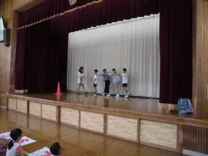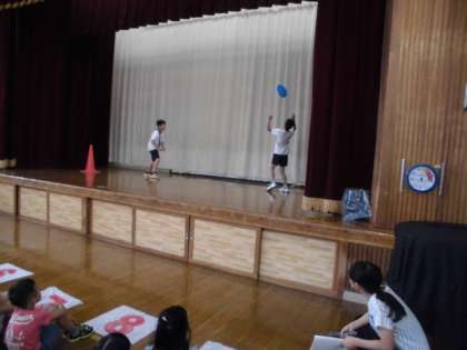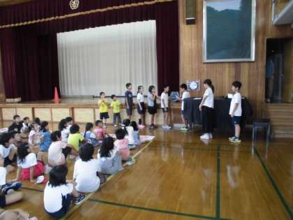 9月の児童朝会は水運びリレーの表彰と,運動会の縦割り競技の説明でした。水運びリレーは5年生が優勝でした。また,たてわり競技のお手本を計画委員の人たちが楽しそうに見せてくれました。明日のわくわくランチで誰が何をするのか話し合うことになっています。