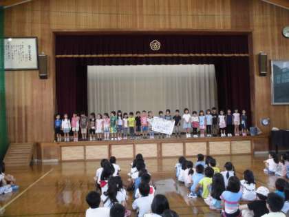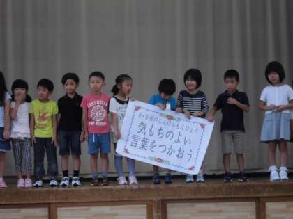 9月の人権目標は「気持ちのよい言葉を使おう」です。1年生が使いたい言葉や使わない方がいい言葉を考え,発表してくれました。全員がノー原稿で一言ずつメッセージを言うことができ,1年生の成長をかんじました。