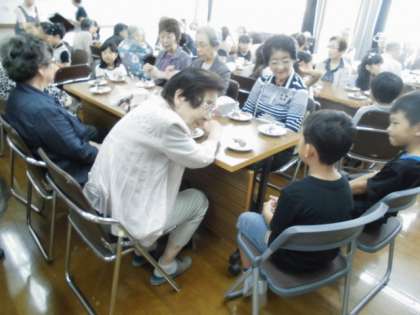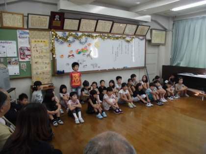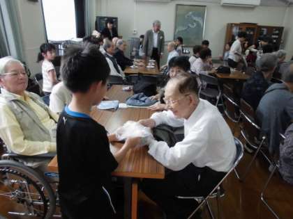 2年生が12日土曜日に敬老会に参加しました。一人ずつ自己紹介をして,「月」を一緒に歌いました。その後,歯医者さんの話を一緒に聞き,一緒に月見だんごを食べました。