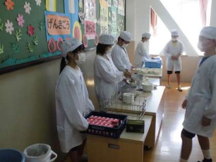 今日からアルマイト食器からペン食器に変わりました。和食の良さをより味わえるようにさくらの模様が入った割れにくく美しい食器です。子どもたちに感想を聞いてみると,「われないから嬉しい」「ご飯粒がきれいに取れる」と喜んでいました。おかずの種類に合わせて5種類の食器を使い分けることになります。