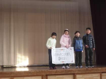 5年生からは1月の人権目標「お互いのことを知り認め合おう」に関する劇発表がありました。