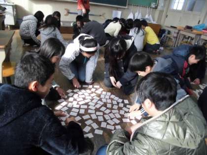 冬休みの宿題で覚えてきた「百人一首大会」をしていました。予選,決勝と2回するようです。卒業までの貴重な時間を楽しく充実して過ごせますように。