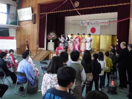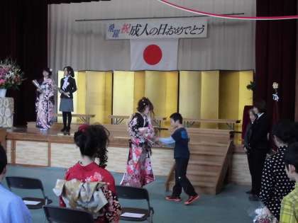 教業,乾両少年補導主催による第16回成人式が行われました。お天気に恵まれ,ご家族,地域の方,来賓の方にたくさんのお祝いの言葉をいただいたことでしょう。2分の1成人式にあたる4年生がお祝いの花束を渡すために参列させていただきました。成人の方の言葉に「自分も4年生の時に振袖のお姉さんに花束を渡しました」と言われていました。4年生の子ども達も10年後に今日の事を思い出すのでしょうか。