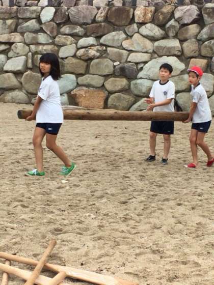 今,雨が上がっていかだづくりを始めています。教室とは違う姿の児童もいるようで,友だちの隠れていた,いいところを発見するのも楽しい4日間だと思います。まだまだ元気いっぱいです。