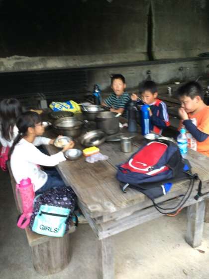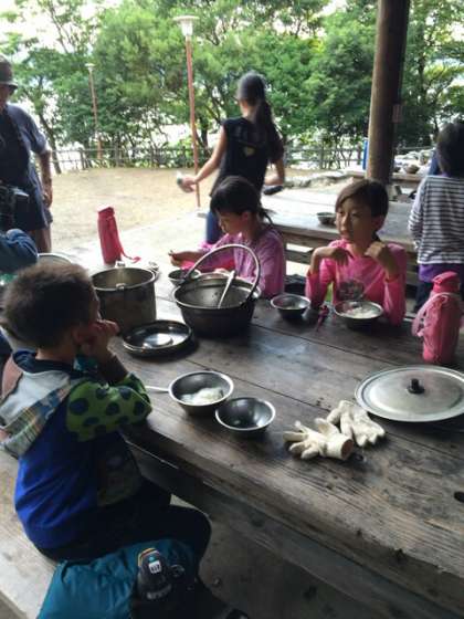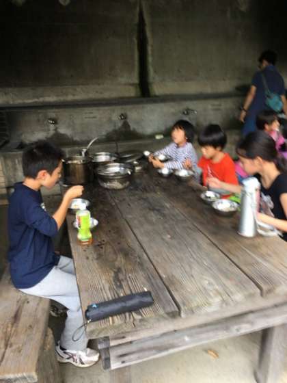 今、17時40分です。ようやく食事を始めました。美味しいと言って食べています。豚丼です。味噌汁も作りました。ご飯はほとんどの班がうまく炊けました。海が見えるところで食べるのもよい経験になったことでしょう。