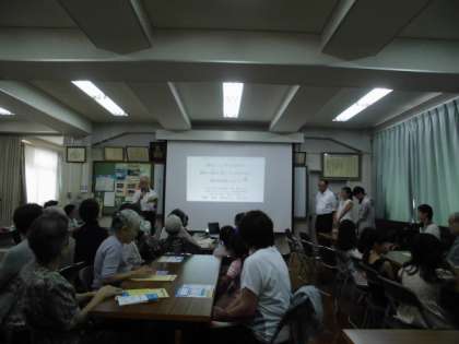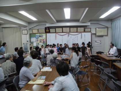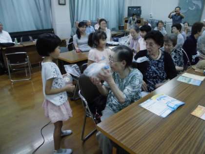 乾のすこやかサロンで敬老の日の集いで2年生が参加しました。一緒にお話を聞いたり,歌を聴いてもらったりしました。最後に一緒にお月見団子をいただいて交流の時間もありました。
