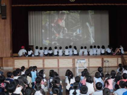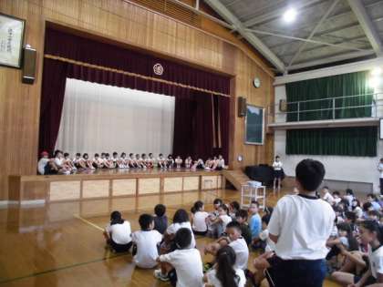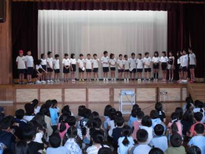 5年生が7月に行った若桜青少年自然の家の野外活動について「こばとタイム」で発表しました。楽しかったこと,協力できたこと,心に残っていることなど,映像を交えて全校に紹介しました。