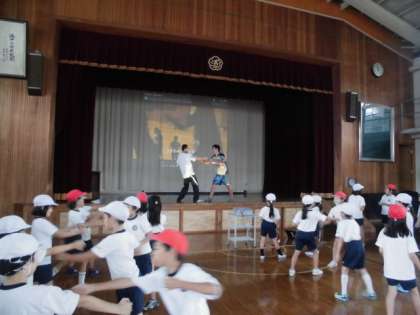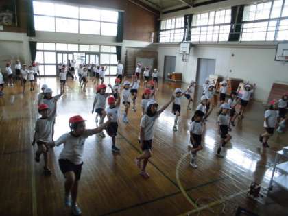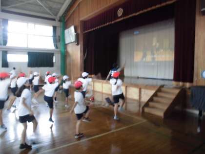 3,4年生は「台風の目」の前にダンスを踊ります。プロジェクターで写したものを一生懸命真似をしているところです。自分で音に合わせて踊れるようになるともっと楽しくなると思います。