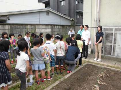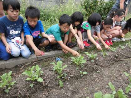 10月1日にまいた大根の種の芽が出てきて,間引くことになりました。タキイ種苗の方に今は根が伸びて大根の長さが決まったということや,一番良い大根の見つけ方などを教えてもらいました。