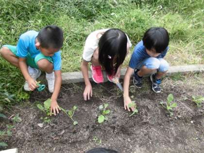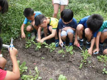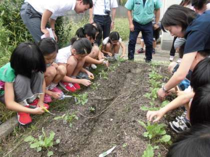 一人一本の大根を育てることになります。虫に食われている葉っぱもあるので,よく観察して虫を取っていかないといけません。