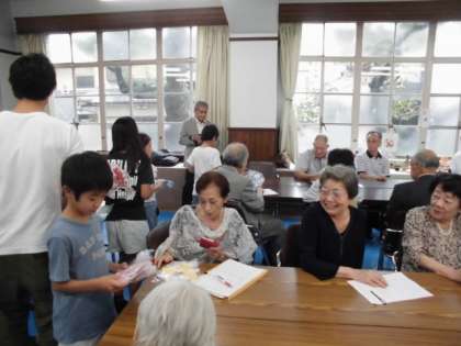 3年生にも手伝ってもらって「なべしき」を作り,参加された高齢者の方々にプレゼントしました。たくさんの拍手をいただきました。