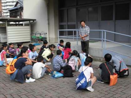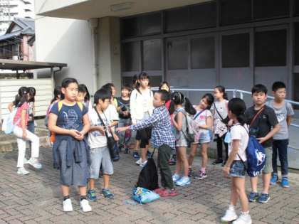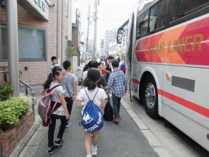 さわやかな秋空。4年生23名が全員元気に京都市野外活動センター奥志摩みさきの家に向けて出発しました。