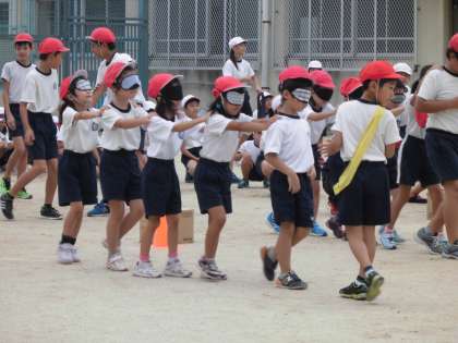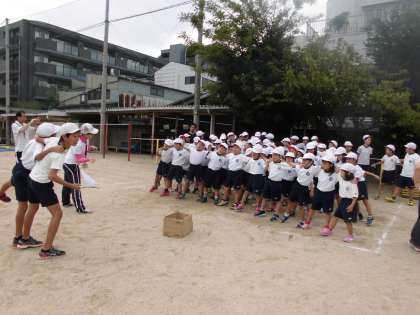 縦割りグループでやるのでいつも一緒に給食を食べたり掃除をしたりしているお兄さん,お姉さんに手をつないでもらったり,騎馬に乗せてもらったりしてうれしそうです。