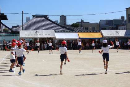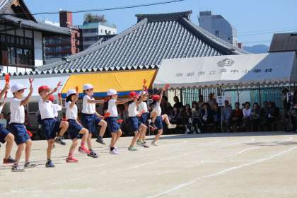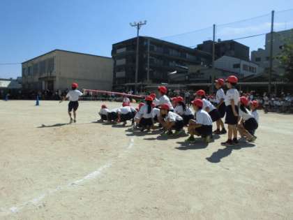 中学年のダンスと台風の目です。鳴子を威勢よく鳴らして踊る姿はかわいかったです。台風の目ではそれぞれのチームで作戦をたてていたようです。応援も素晴らしかったと思います。