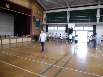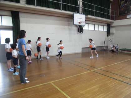 部活動が始まり,今日はバスケットボールの日です。準備運動や基本の練習に汗を流しています。異学年で練習し,教え合ったり励まし合ったりできるよう指導していきます。