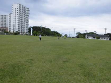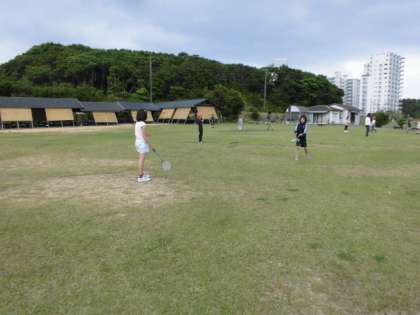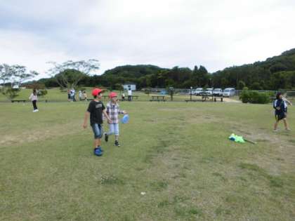 晩御飯までの間,少しだけ時間があります。芝生広場でみんなで遊びました。少しだけ小雨が降りましたがすぐにやんで,暑くなくて快適です。それでも思い切り遊んで汗ばむ人もたくさんいました。
