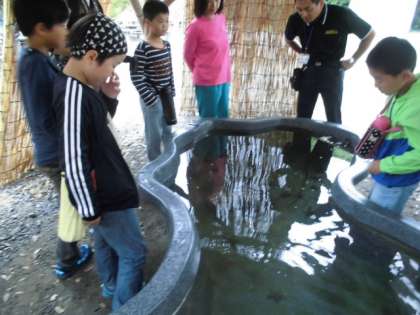 所員の方に説明を受けて,子どもは危ないので大人がかごを投入します。「えい!えい!」とコールしたり,「まぐろ、まぐろ」と拝んだりしてかご漁仕込が終わりました。運がよければ夕方には、、、、みさきの家にある水槽にいれて触るだけですが。