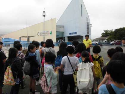 志摩マリンランドにつきました。宮崎浜の磯観察の時に講師に来ていただいた先生を見つけてびっくり。まんぼうの看板と2種類のペンギンもお出迎えしてくれました。