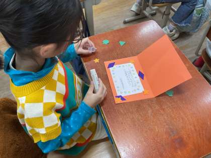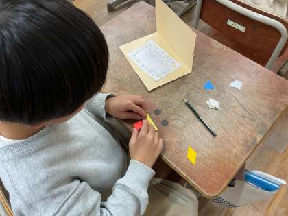 集めた形を使って、「Thank youカード」を作り始めました。送る相手は、いつも登下校を見守って下さっている見守り隊の皆さんです。心を込めて作っています。