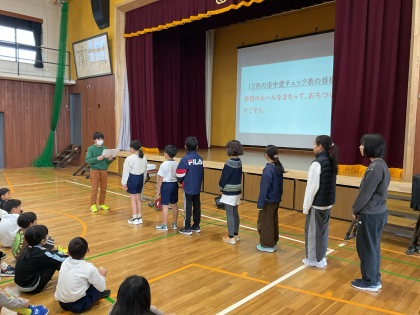 児童朝会がありました。11月に行った〇×クイズ大会で見事優勝した7名の子たちの表彰をしました。計画委員会が作った賞状を委員長が読み上げて、一人一人に渡しました。おめでとうございます。