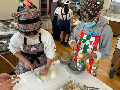 調理実習がありました。「野菜のベーコン巻き」「厚あげと野菜のチャンプル—」「ベーコンポテト」から一品を決めて、グループで作りました。調理計画を立てていたので、手際よく作ることができました。野菜の皮をむいたり、包丁で切る作業も怪我無く、安全に行うことができました。