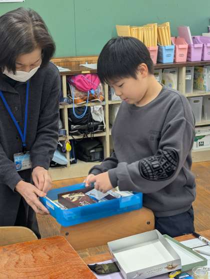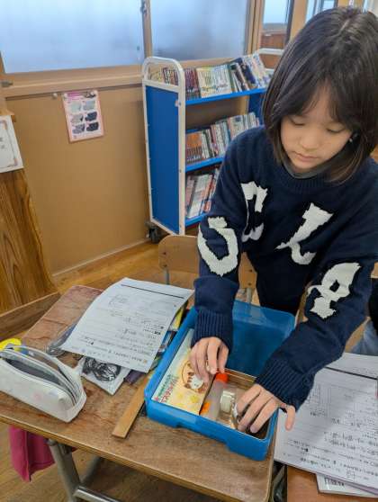 家庭科「物を生かして住みやすく」の学習では、整理整頓や身の回りの清潔について学習しています。今回は整理整頓の一つとして、自分のお道具箱の整理整頓をしました。引出しからお道具箱を出すと、要らないものがいくつも出てくる子もいました。まずは整理、それから箱を使って整頓をしました。使いやすいお道具箱になるように、思い思いに工夫していました。