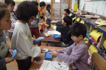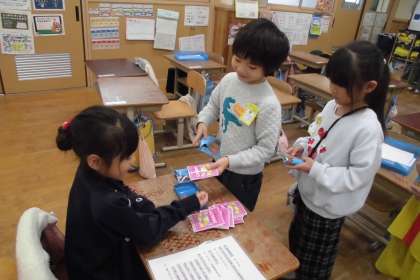単元の週末は、お買い物あそびをしています。何回か繰り返していくうちに、お金が足りない…ということが起こり、銀行やさんもできました。物を買ったり、売ったりしながら、おつりや両替の仕組みも分かってきているようです。