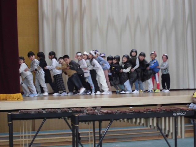 1年生の学習発表会の練習風景です。舞台の上に上がってきっとドキドキしていると思います。でも、みんなで力を合わせて練習しています。本番が楽しみです。