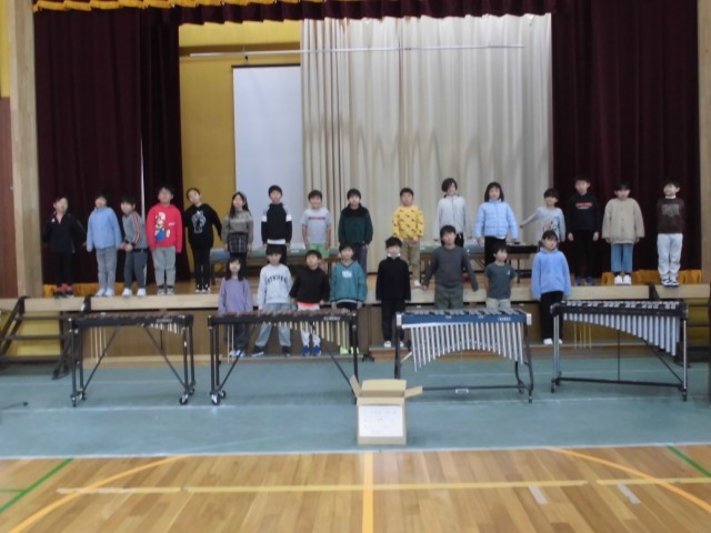 2年生の学習発表会の練習風景です。リズム打ち、鍵盤ハーモニカの演奏、歌など2年生で学習したことを発表します。元気いっぱいの2年生。心をひとつにがんばります。