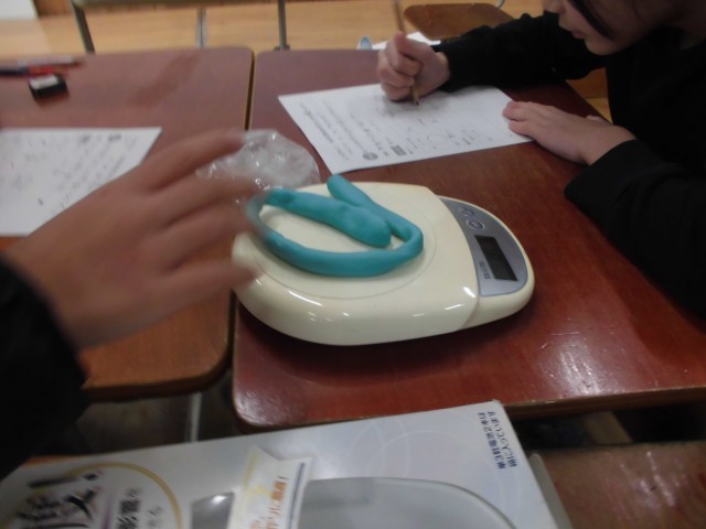 理科「ものの重さ」の単元を学習しています。今日は、「ものの形を変えると重さは、変わるだろうか。」を粘土を使って実験しました。電子てんびんを使って粘土の形を変えて重さを測りました。予想は、みんな「重さは、変わらない。」でした。グループで協力しながら粘土を平にして、細長くして、分けての順で実験を進めて結果を表にまとめました。予想通り、重さは、変わりませんでした。次は、紙コップを使って実験します。電子てんびんの使い方も上手です。