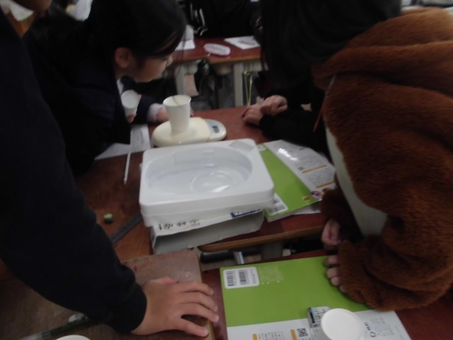 「ものの重さ」の学習では、先週は粘土を使って実験しました。今日は、紙コップをたたむ、丸める、分けるなどして実験しました。