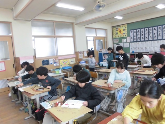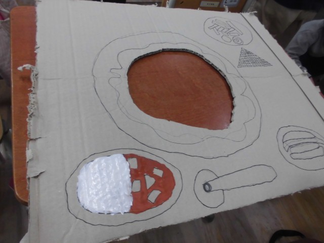 ダンボールに自分の顔の大きさの丸い穴をあけて「何かになったり」「どこかに行けたりする」顔だしパネルを作っています。お好み焼き、ピザ、信号機、宇宙飛行士などいろいろなものから顔が出てきます。今日は、ふでに水を少しつけて濃い絵の具で色をつけました。ふでの使い方や使うふでの大きさを考えながら進めました。後片付けも早くできるようになっています。