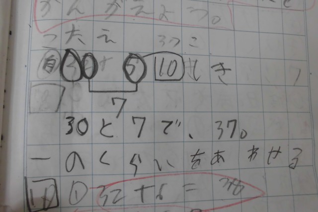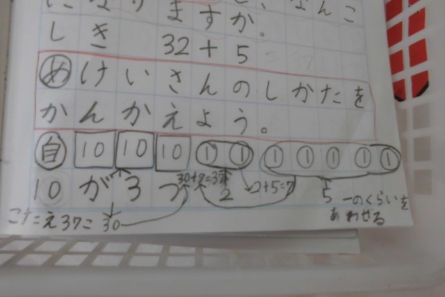 この日も「32+5」の計算の仕方を考えました。子どもたちのノートはバッチリでした。